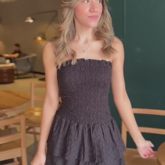 Vestido en ojalillo bordado. Top straple en hilo elástico, falda en boleros. ¡ Una pieza clásica y elegante!