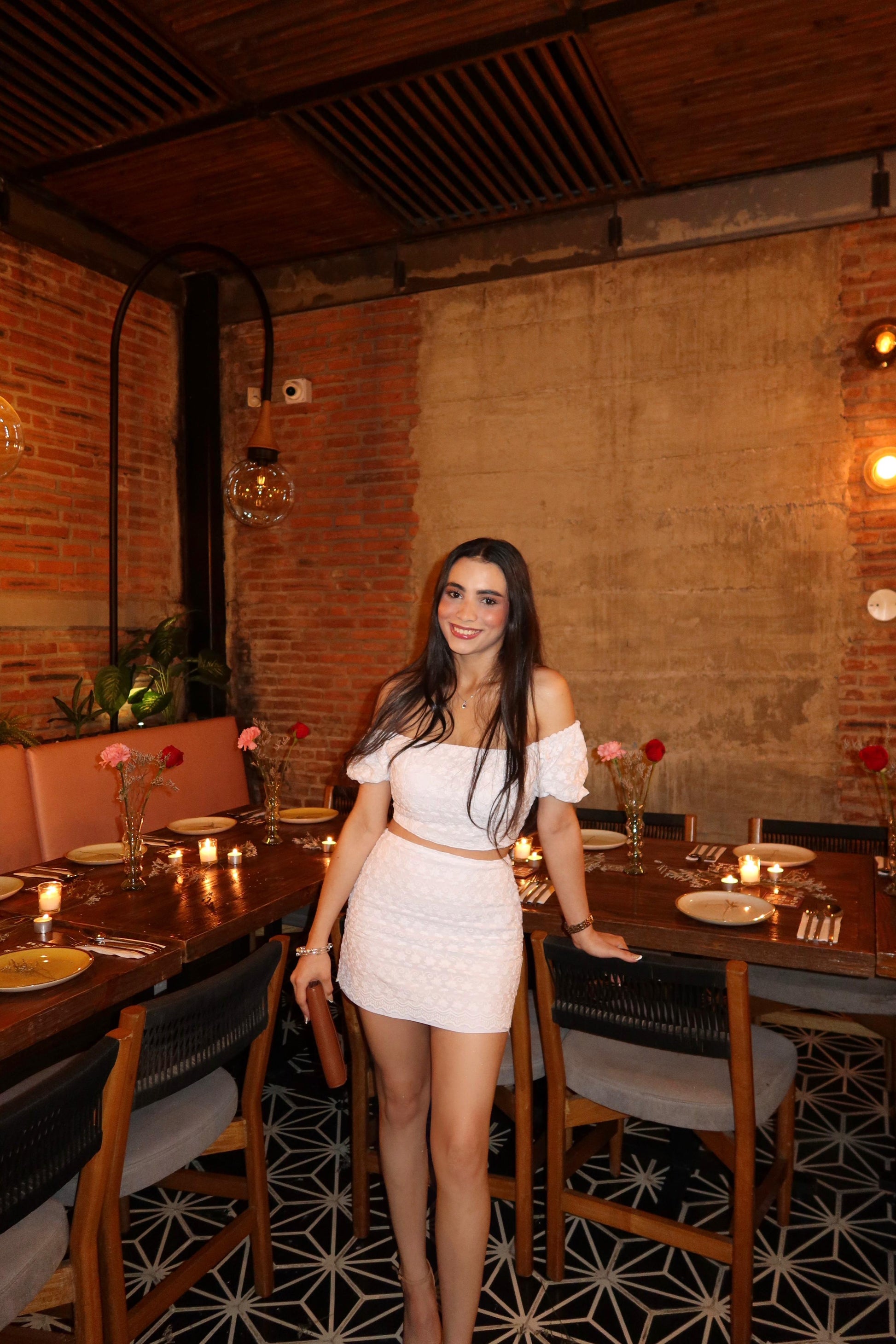 Nuestro set serena está elaborado en delicado ojalillo bordado, con un top de mangas globo que aporta volumen y feminidad, y una falda recta que estiliza la figura con un aire elegante pero versátil.