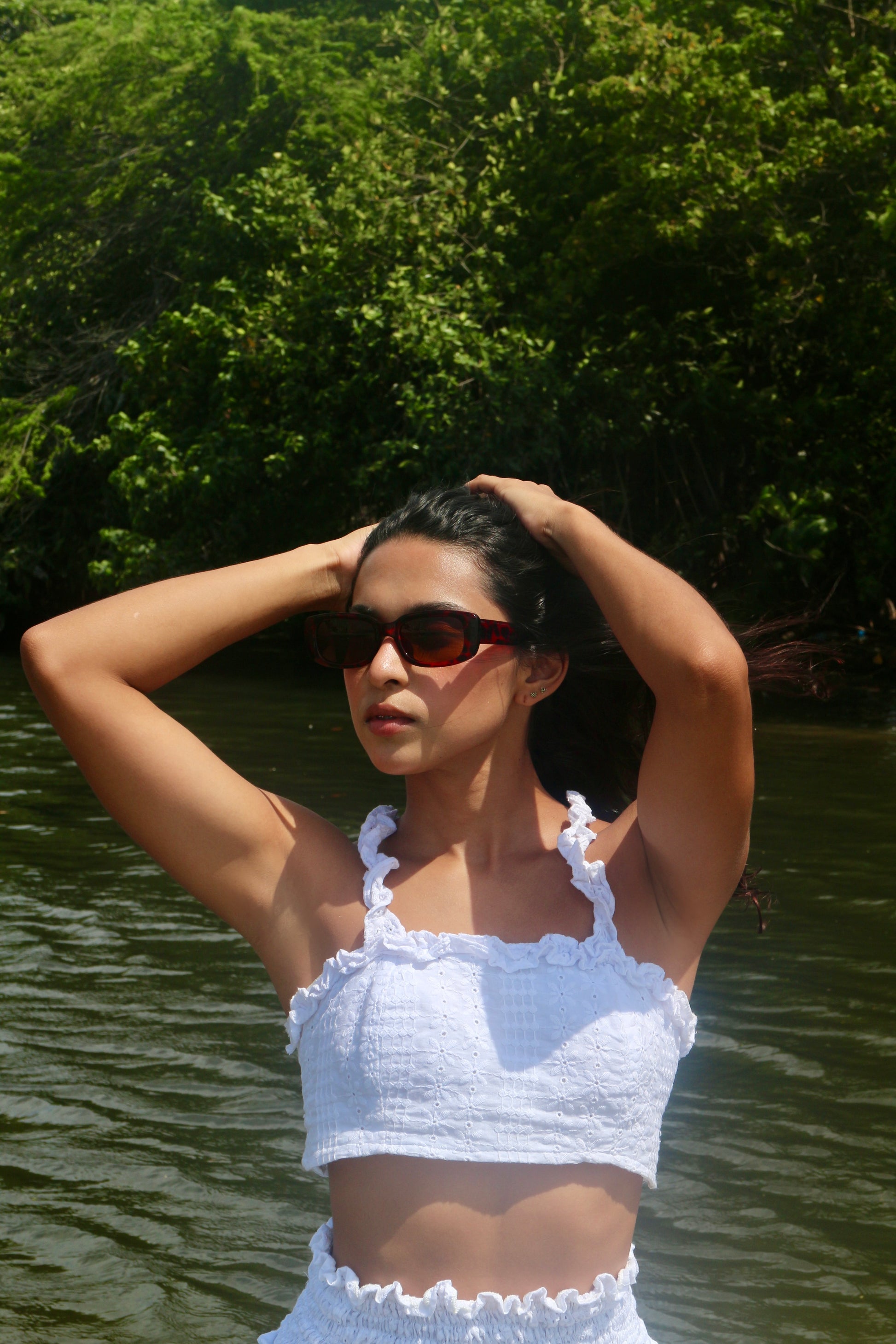 Elaborada en ojalillo bordado, este top resalta por su diseño femenino, elegante y fresco. Su ajuste en la espalda con hilo elástico garantiza comodidad y un fit favorecedor.